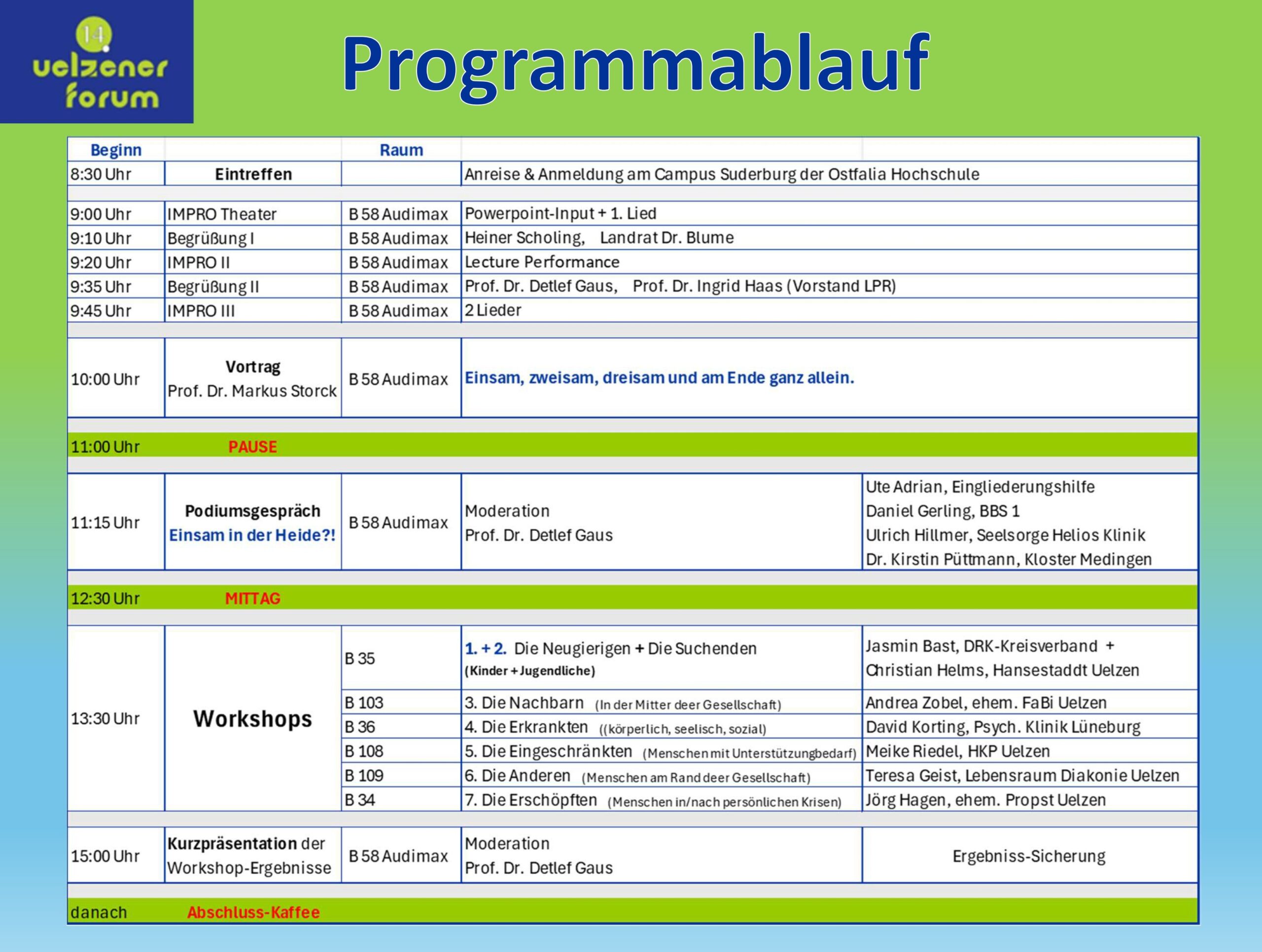 Das 14. Uelzener Forum des Präventionsrates beleuchtet Einsamkeit als ein vielschichtiges individuell und zugleich gesellschaftlich relevantes Phänomen, das alle Altersgruppen betrifft. Einsamkeit hat als existenzieller Ausdruck des Menschseins über alle Entwicklungsphasen aber auch durchaus potenziell positive Seiten wie z.B. das Eins-Seins mit sich oder die meditative Versenkung. Einsamkeit wird also nicht einseitig negativ, sondern im Spannungsfeld als subjektive Erfahrung und als strukturelles Problem einer individualisierten Gesellschaft aufgefasst.