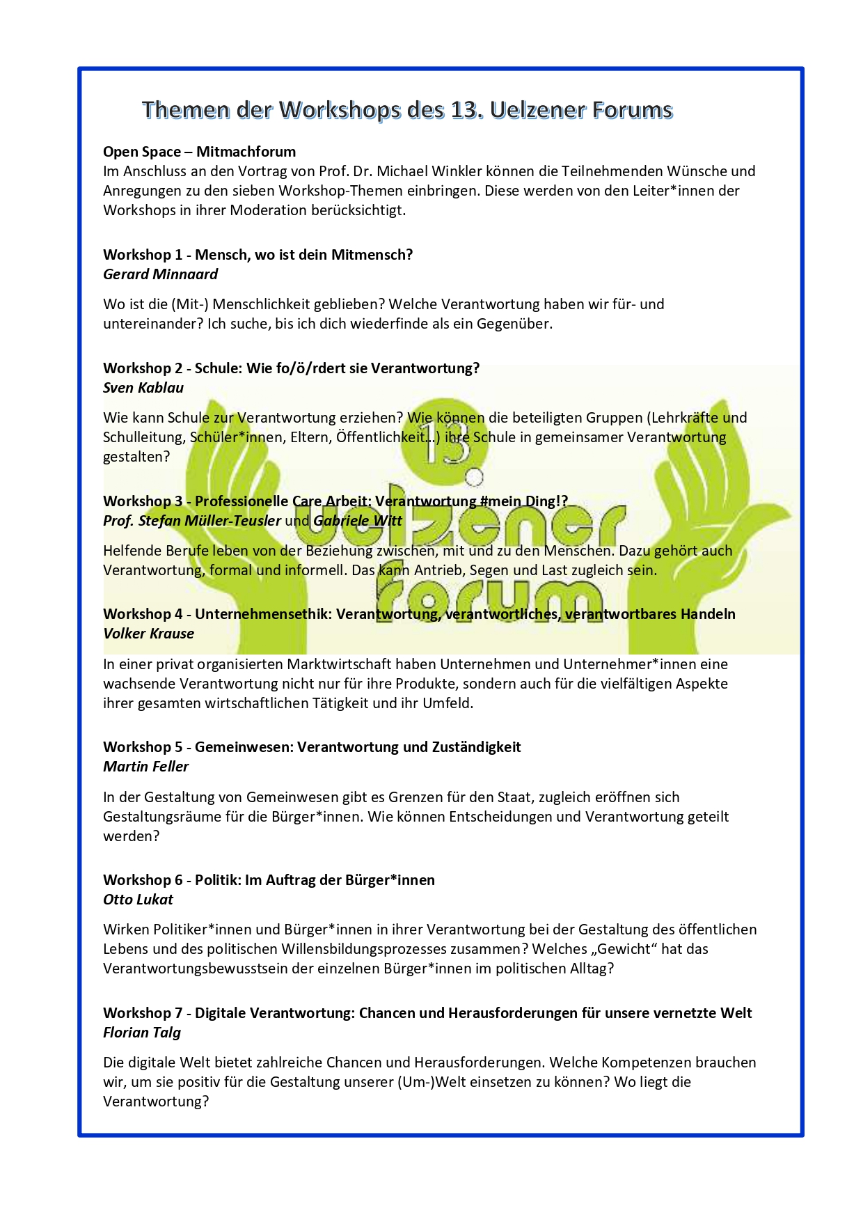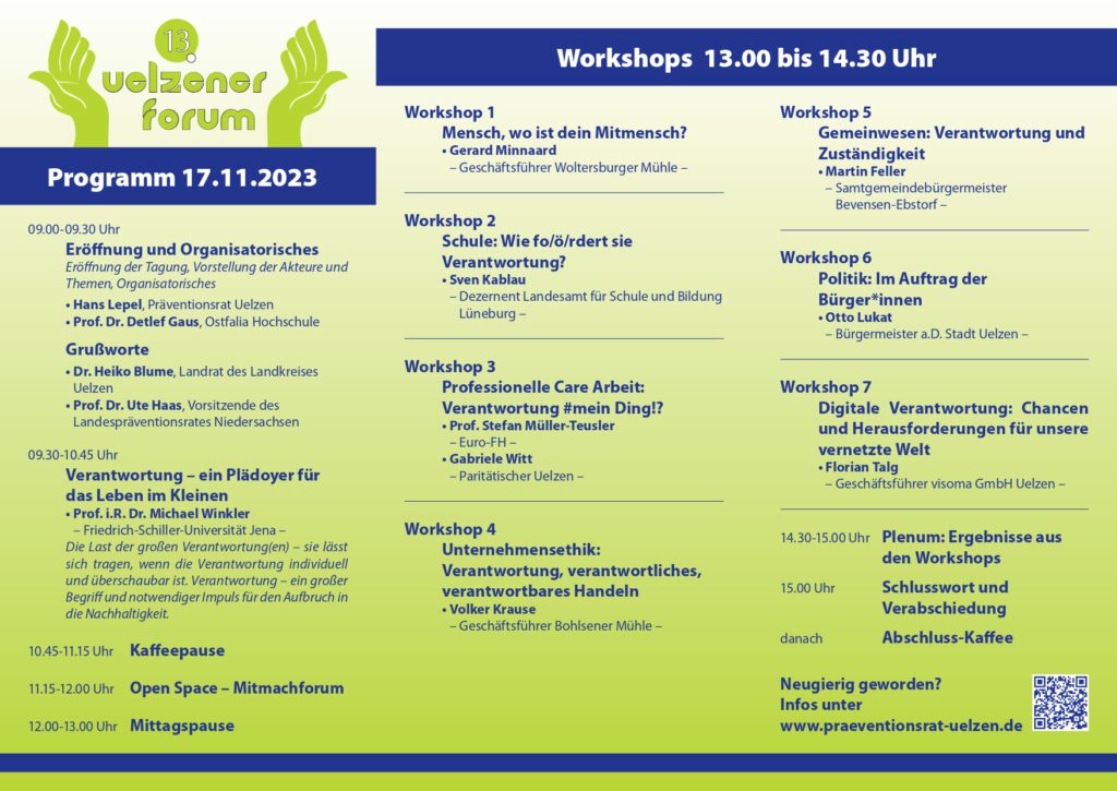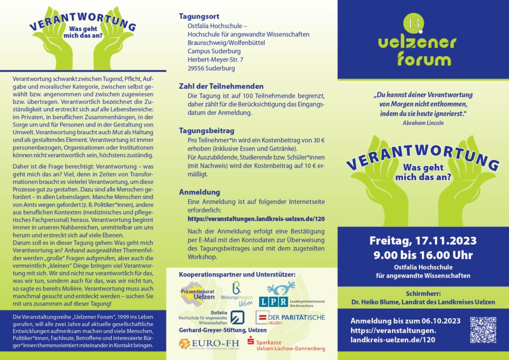 Die Veranstaltungsreihe „Uelzener Forum“, 1999 ins Leben gerufen, will alle zwei Jahre auf aktuelle gesellschaftliche Entwicklungen aufmerksam machen und viele Menschen, Politiker*innen, Fachleute, Betroffene und interessierte Bürger*innen themenorientiert miteinander in Kontakt bringen.